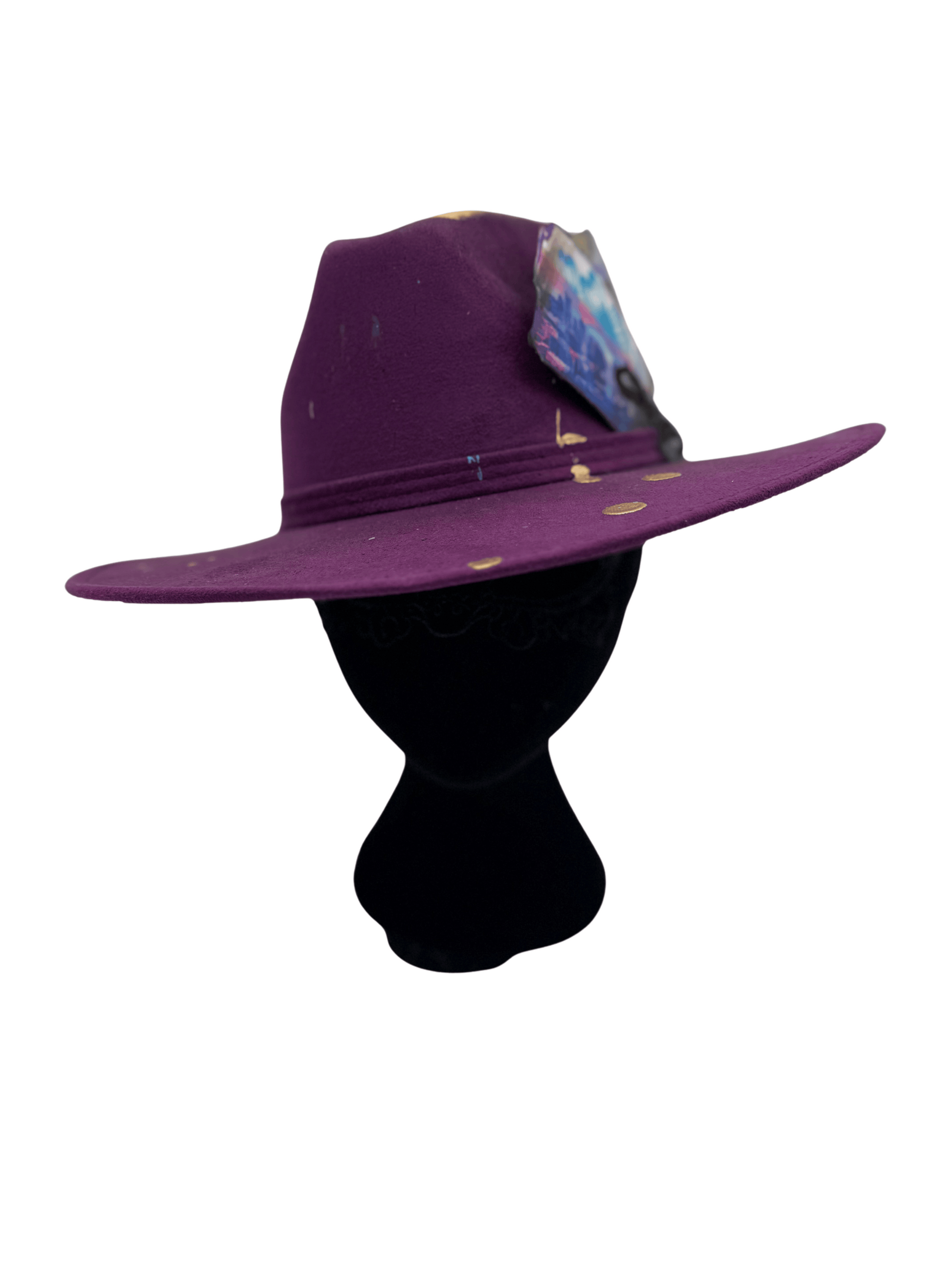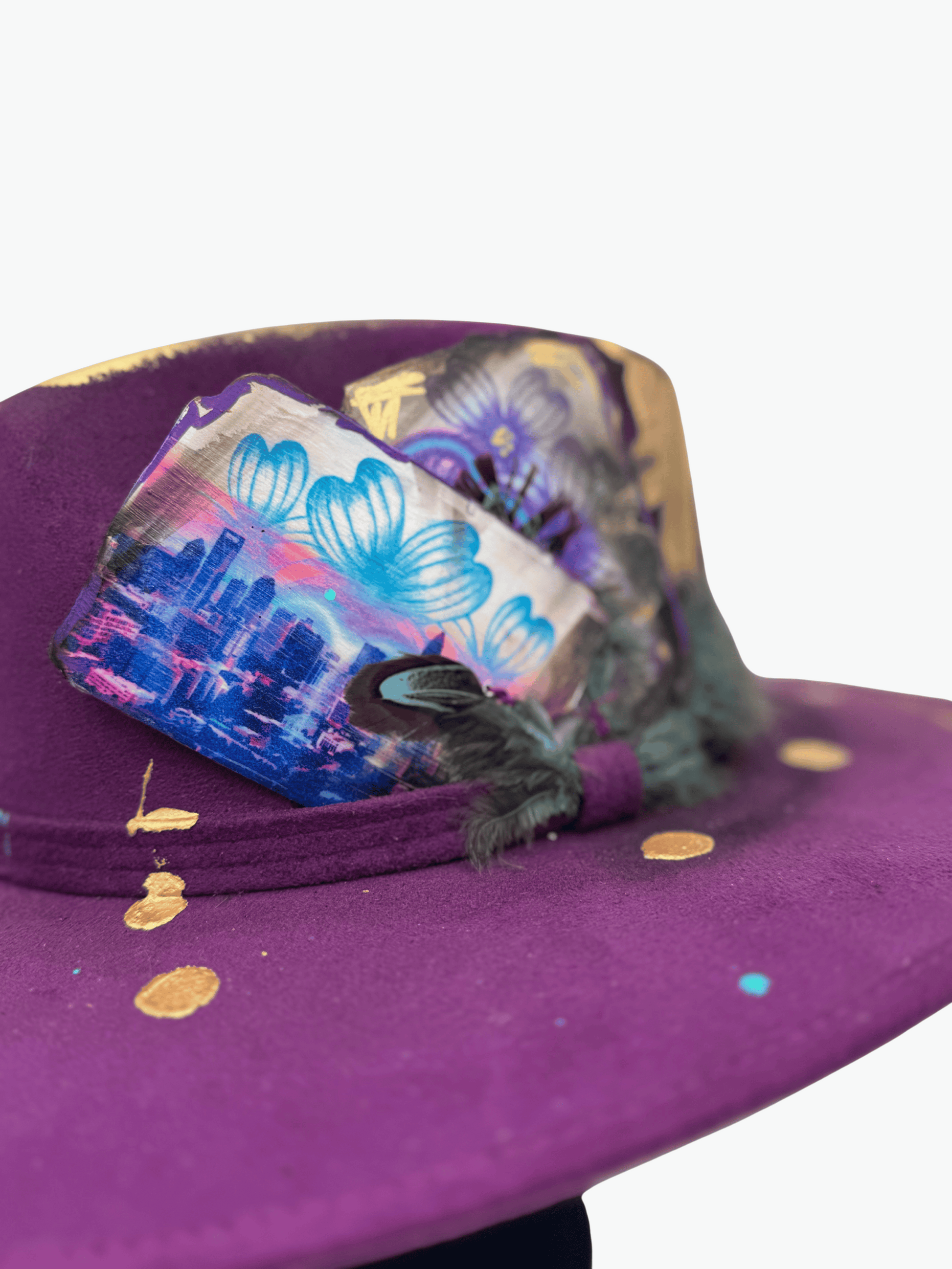 Step into your spotlight with the “City Crown”, a hand-embellished masterpiece that brings art, place, and spirit together in one unforgettable hat. Crafted from rich purple vegan suede, this statement piece features hand-painted gold splatters that shimmer like city lights against the night sky.
