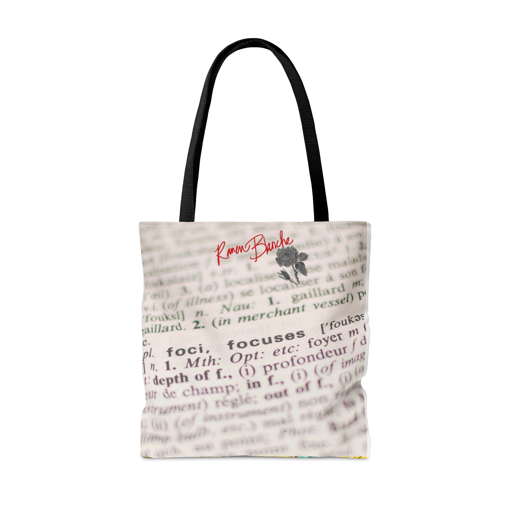 Specs: 100% Polyester Black Cotton Handles Black Lining Size tolerance 0.75” (1.9 cm) Designed by: Raven Blanche Studio