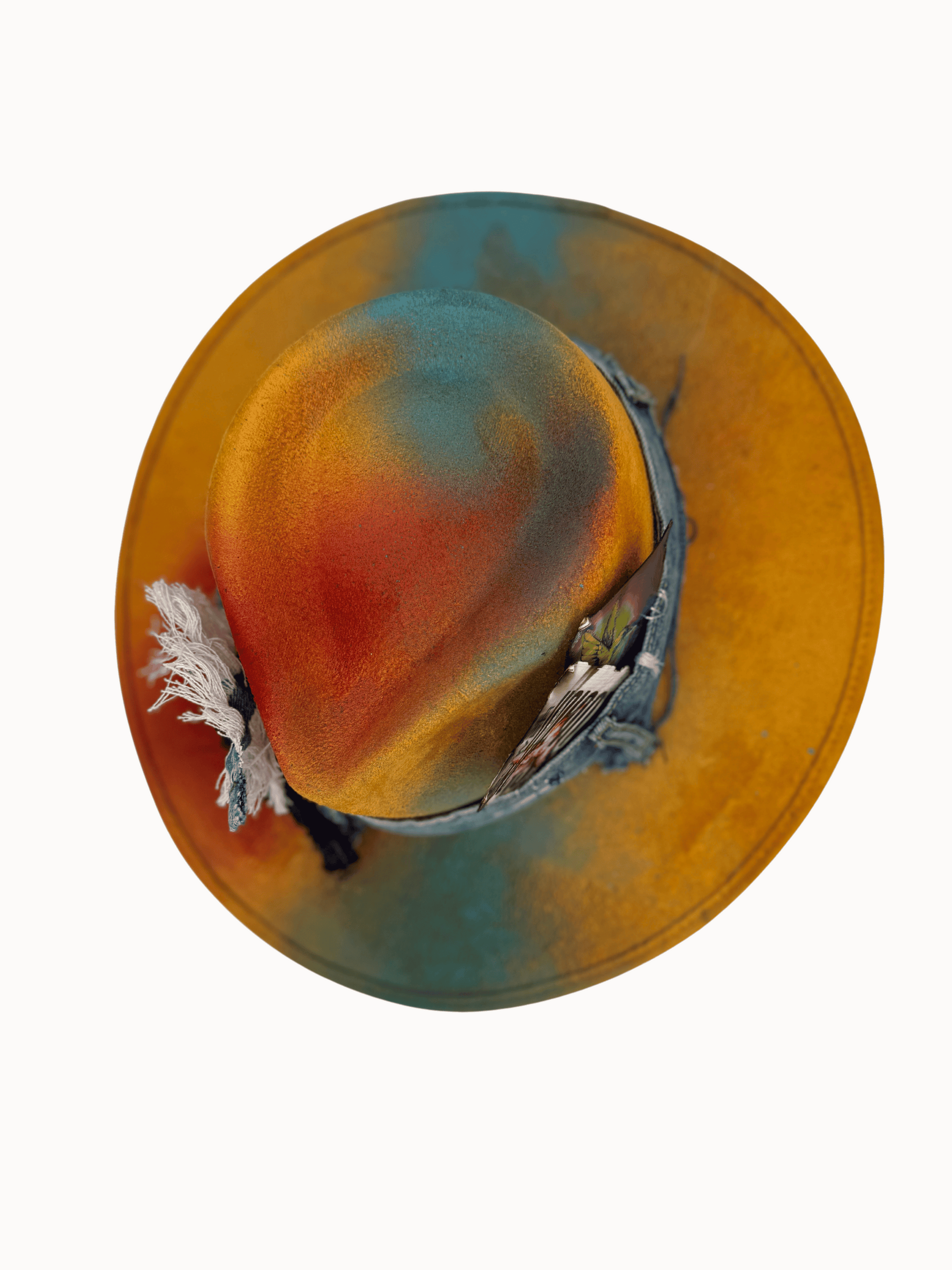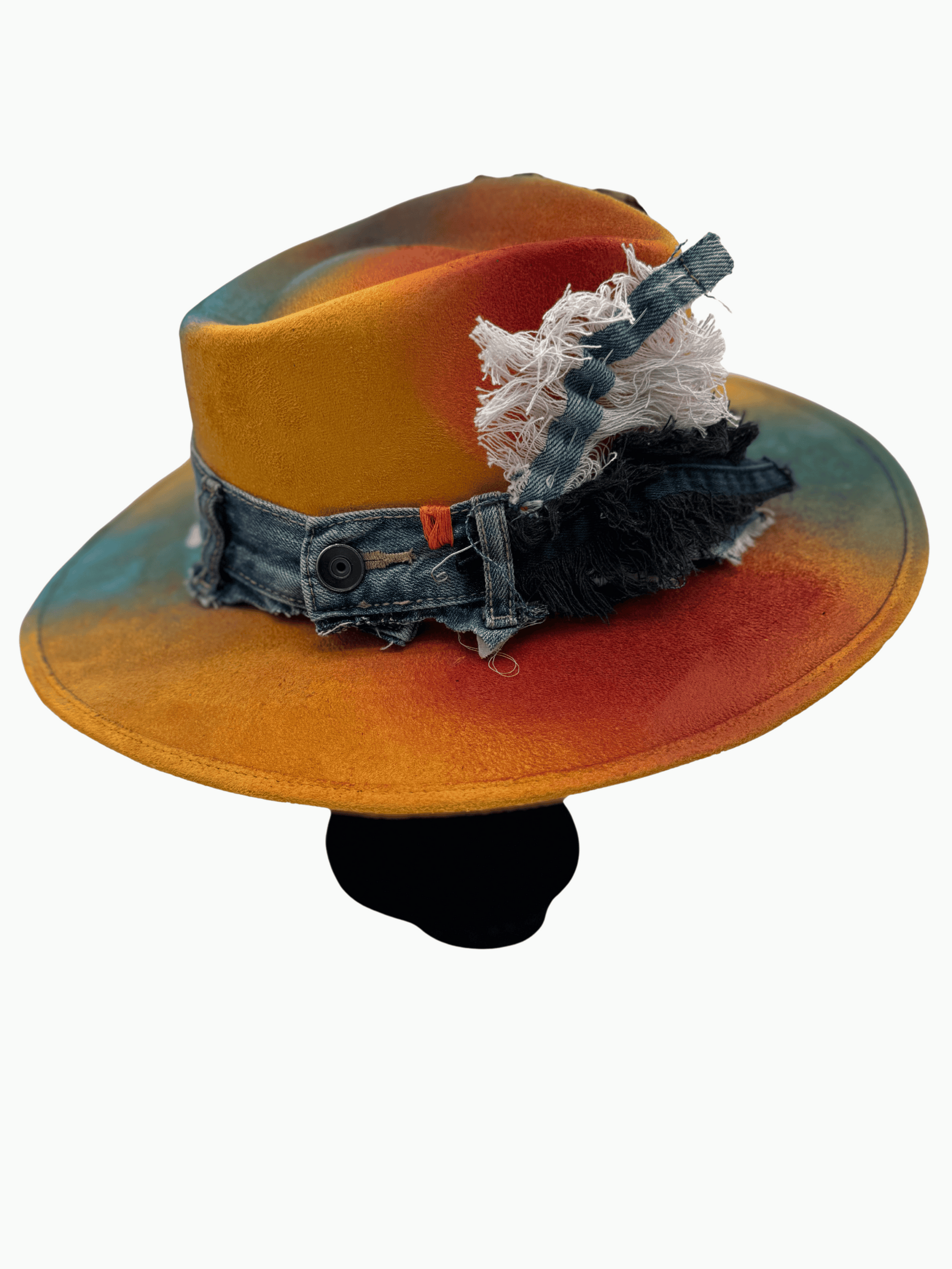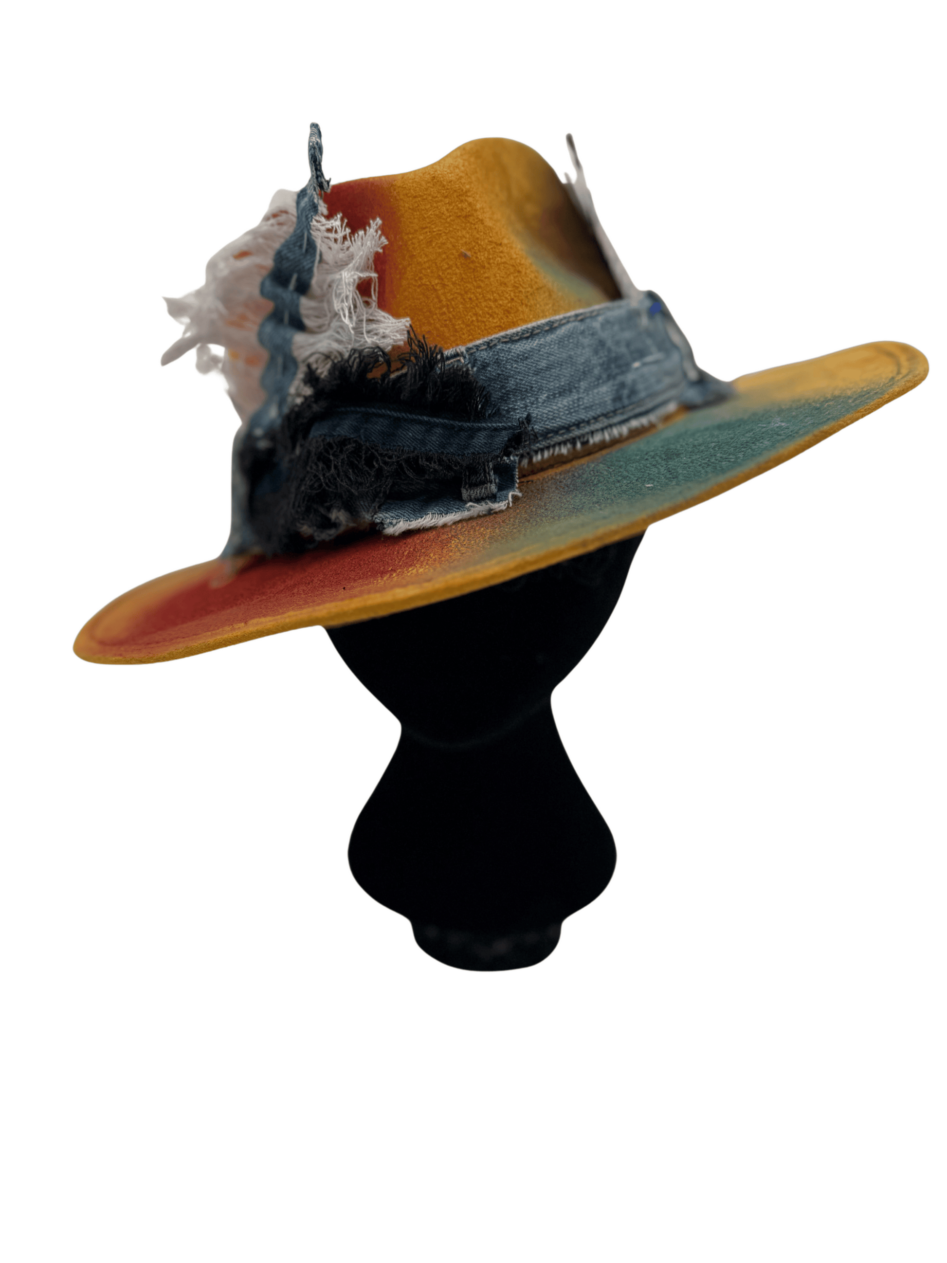 Infused with creative fire and urban texture, the “Mustard Crown” is a wearable canvas that brings art and attitude together in one powerful accessory. This one-of-a-kind piece features a mustard yellow vegan suede base, hand-painted with spontaneous color splashes that echo movement, spirit, and style.