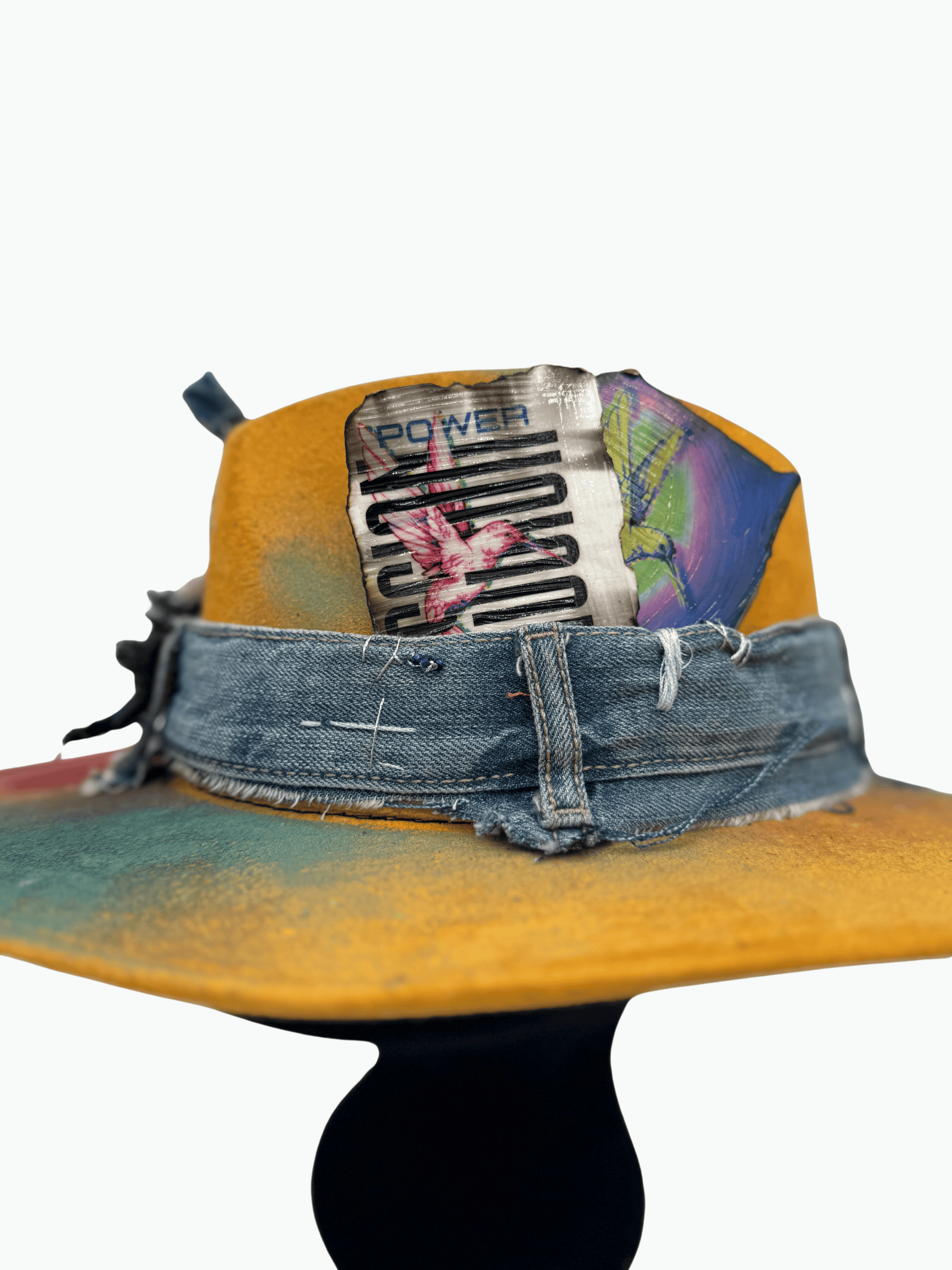 A rugged denim brim band wraps around the crown, offering a sharp contrast in texture and tone. Tucked inside the band are two handcrafted art playing cards, featuring exclusive Raven Blanche Studio artwork—turning your hat into a mobile gallery of empowerment.