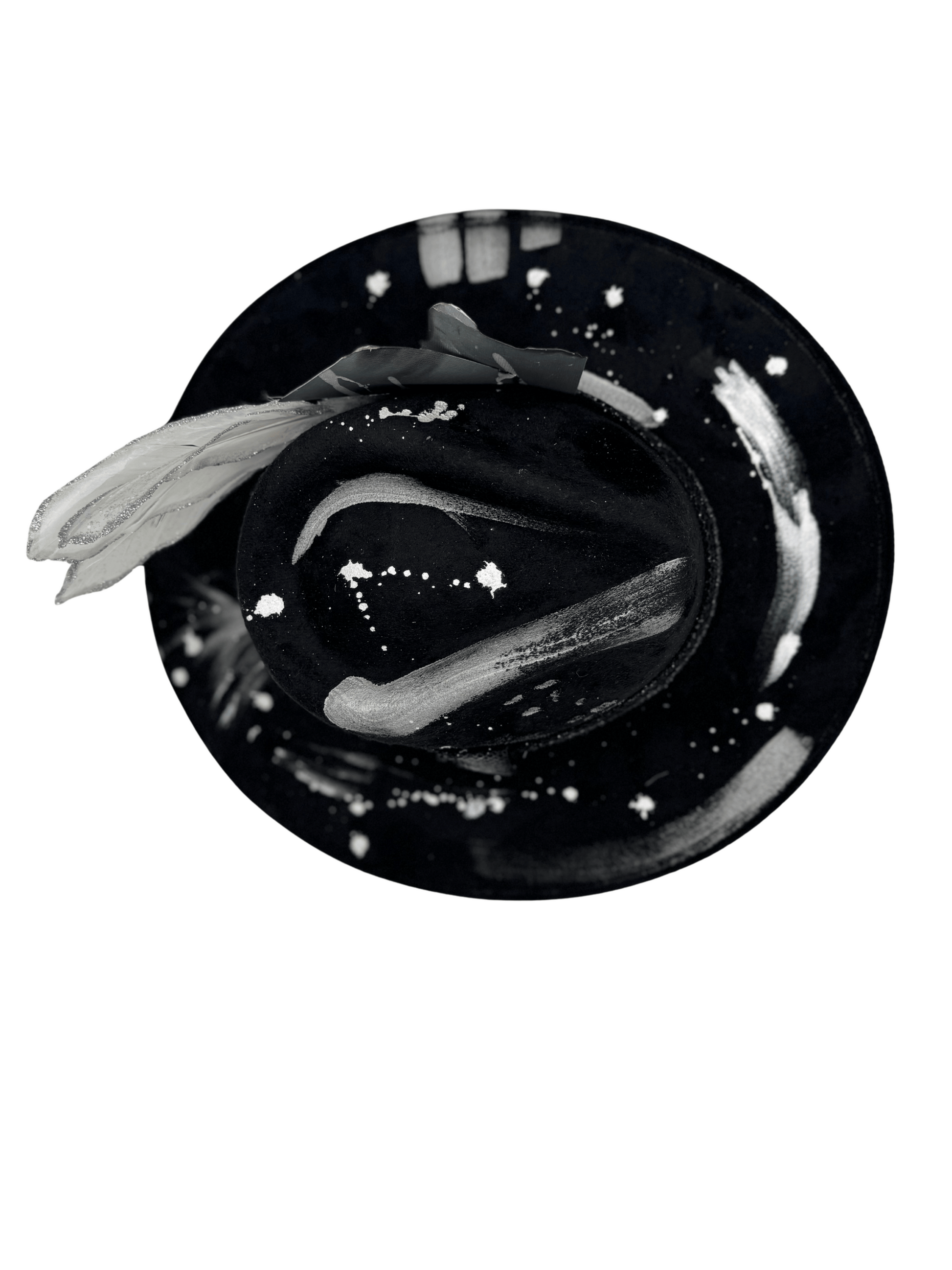 Step into your mystic era with the “Mystic Eclipse” — a refined, shadow-drenched iteration of Raven Blanche Studio’s iconic hand-customized hats. Crafted from jet black vegan suede, this wide-brim piece features hand-splattered silver paint, reflecting flashes of intuition and insight like stars in the midnight sky.