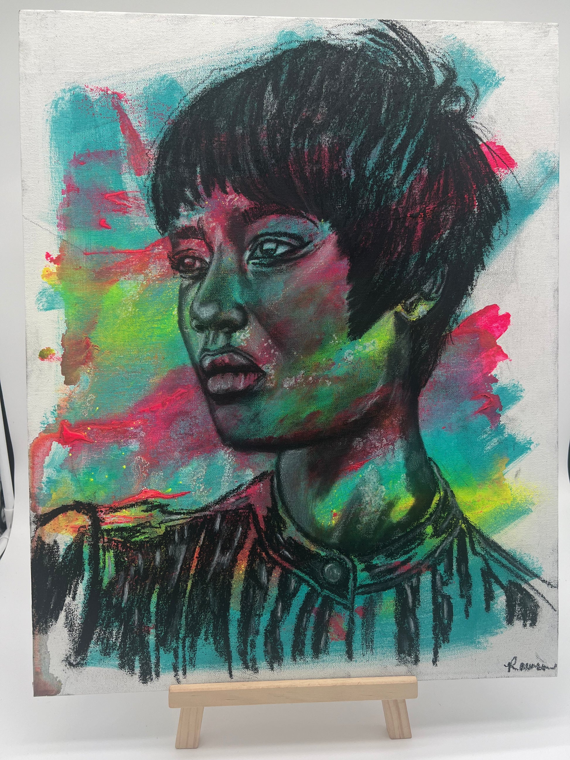 Untitled is a raw and expressive portrait of a woman with short hair, sketched in deep black charcoal with soft pastel accents. Her figure—bold, yet graceful—emerges from a vibrant acrylic background painted in sweeping streaks of pink, blue, and green. Created on a flat 16 x 20 inch canvas panel, this piece is a striking contrast between monochromatic drawing and vivid color, capturing emotion, movement, and strength in a single frame.